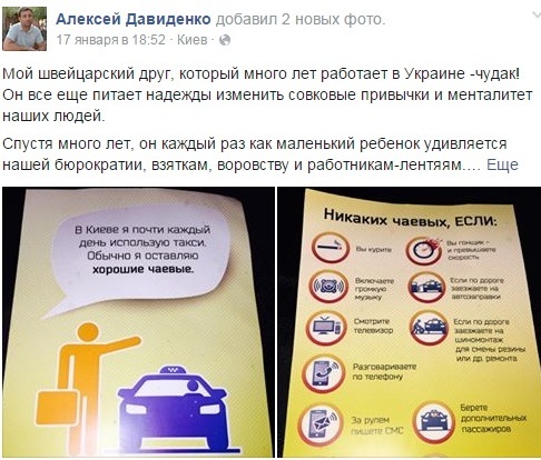 "Мой швейцарский друг, который много лет работает в Украине - чудак! Он все еще питает надежды изменить совковые привычки и менталитет наших людей. Сегодня, провожая его к такси, я увидел в его руках яркую бумажку: