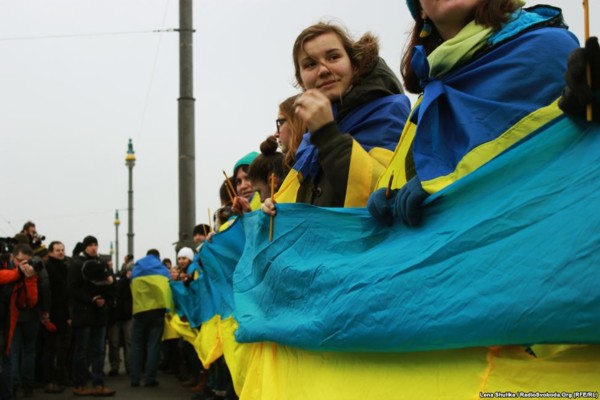 Киевляне соединили берега Днепра живой цепью в честь Дня соборности Украины.