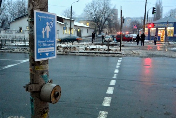 В Киеве возле проблемного пешеходного перехода, где чтобы перейти дорогу, нужно использовать специальную кнопку на светофоре, установили информационные таблички для пешеходов.