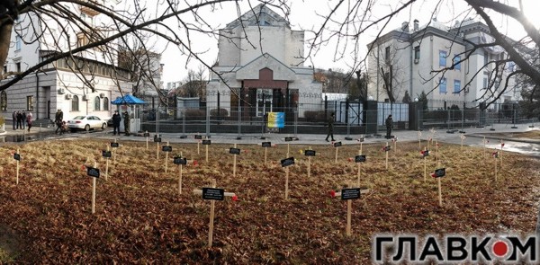 Во время акции перед окнами российских дипломатов были установлены кресты с именами погибших.