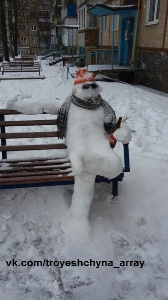 Одного из снежных обитателей района украсили шарфом и шапкой, и снабдили пивной бутылкой и сигаретой.