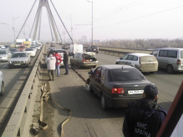 Авария произошла из-за уборочной машины, которая стояла на мосту и собирала снег вдоль отбойника. Затруднено движение с Оболони в сторону левого берега.