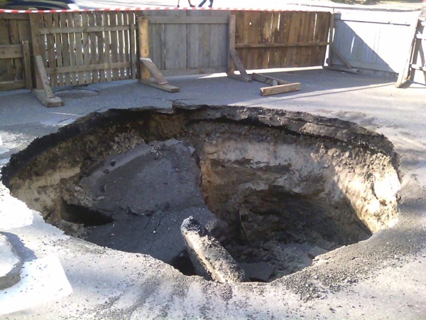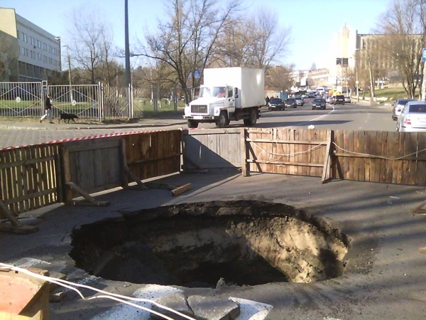 Дорожное покрытие ушло под землю из за треснувшего коллектора который проходит как раз под улицей, вода подмыла грунт и естественно случился провал. Движение на улице ограничено, яма ограждена, на месте работают сотрудники "Киевводоканала".