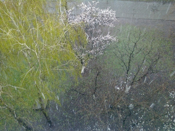 20 апреля проснувшись жители Киева ахнули. Глянули в окно – а там валит мокрый снег! Мокрые лохмотья падают прям на цветущие абрикосовые деревья.