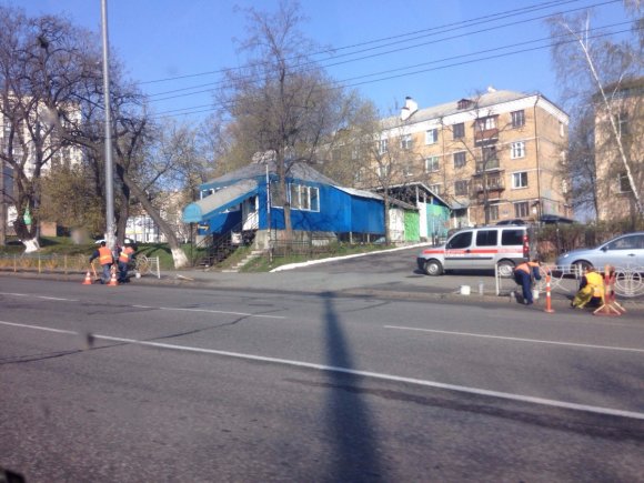 На ул. Василия Липковского журналисты увидели как желто-голубой цвет закрашивают серым. В мэрии нам объяснили: не успели купить краску.