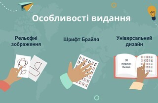 За її словами, видання стало першим в Україні, створеним за принципами універсального дизайну, який поєднує плоскодрукований збільшений шрифт, рельєфні кольорові зображення та шрифт Брайля.