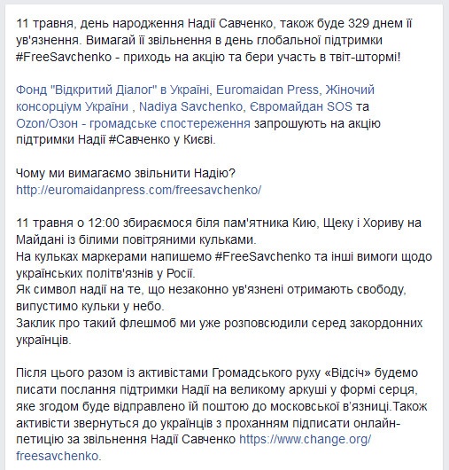 "11 мая в 12:00 собираемся у памятника Кию, Щеку и Хориву на Майдане с белыми воздушными шариками. На шариках маркерами напишем #FreeSavchenko и другие требования в отношении украинских политзаключенных в России", - сообщают организаторы акции.