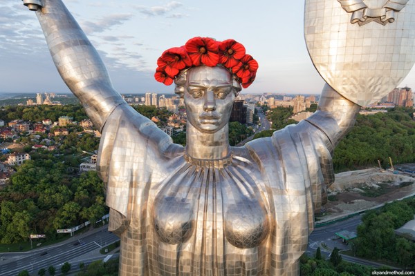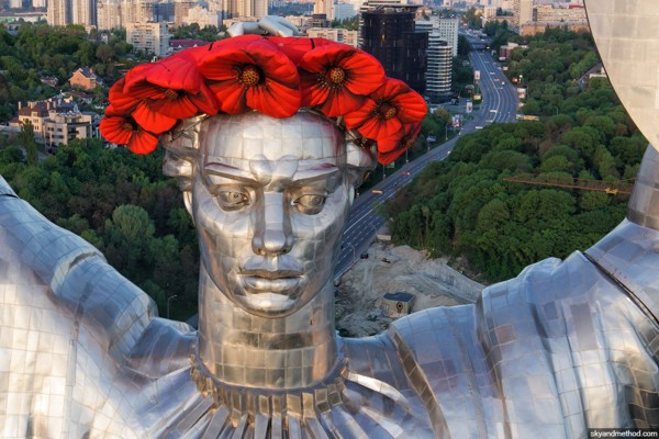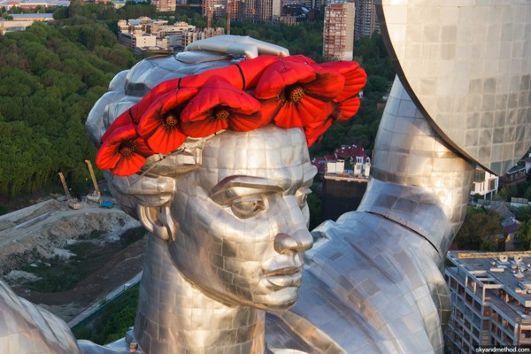 В Киеве облагородили Родину-мать, одев на ее голову венок из красных маков.