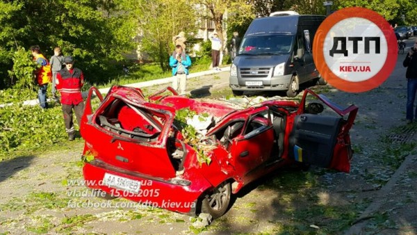 По предварительным данным, автомобиль Mitsubishi Colt двигался по ул.Краснопольской от Светлицкого к Западинской. От сильного порыва ветра дерево, стоявшее у дороги, упало на столб, который в свою очередь упал прямо на едущий автомобиль, сообщает Dtp.kiev.ua.