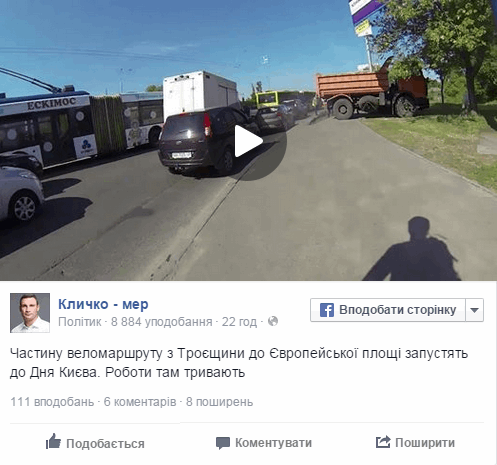 Между тем мэр Киева Виталий Кличко на своей странице в Facebook написал, что "часть веломаршрута с Троещины до Европейской площади запустят ко Дню Киева. Работы там продолжаются".