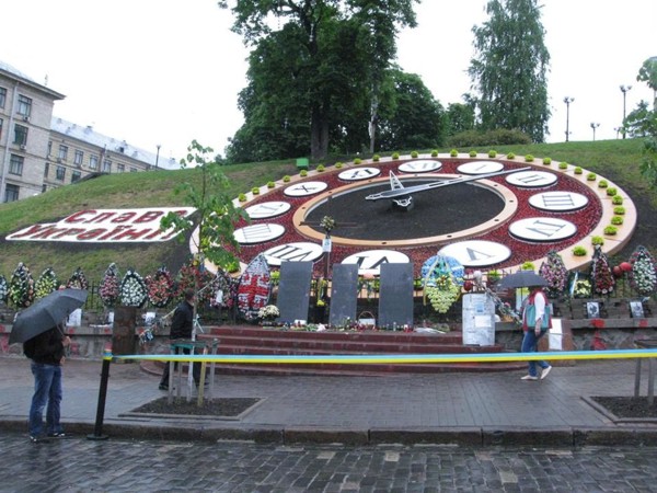 Возле цветочных часов размещена надпись "Слава Україні!".