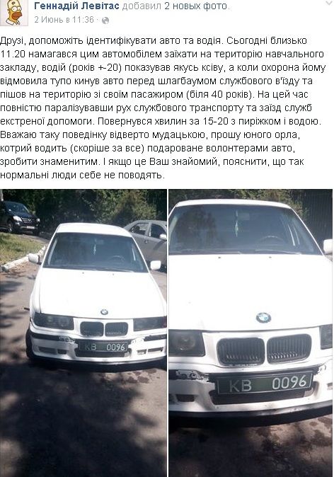"Помогите идентифицировать авто и водителя. Сегодня (2 июня. – Ред.) около 11:20 пытался этим автомобилем заехать на территорию учебного заведения. Водитель (лет +-20) показывал какую-то ксиву, а когда охрана ему отказала, тупо бросил авто перед шлагбаумом служебного въезда и пошел на территорию со своим пассажиром (около 40 лет). На это время полностью парализовав движение служебного транспорта и заезд служб экстренной помощи", - сообщил Левитас.