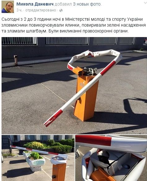 "Сегодня с 2 до 3 часов ночи в Министерстве молодежи и спорта Украины злоумышленники выкорчевали елки, вырвали зеленые насаждения и сломали шлагбаум", - сообщил Даневич.