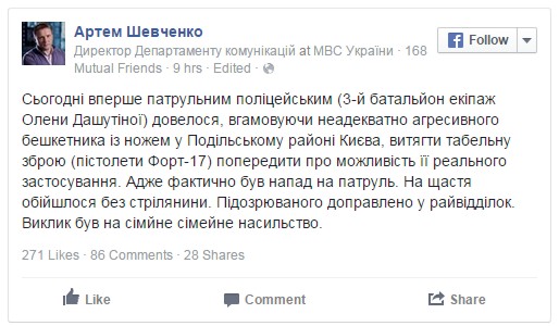 "3-му батальону экипажа Елены Дашутиной пришлось, успокаивая, неадекватно агрессивного дебошира с ножом в Подольском районе Киева, извлечь табельное оружие (пистолеты Форт-17), чтобы предупредить о возможности ее реального применения", - сообщил пресс-секретарь МВД Украины Артем Шевченко на своей странице в Facebook.