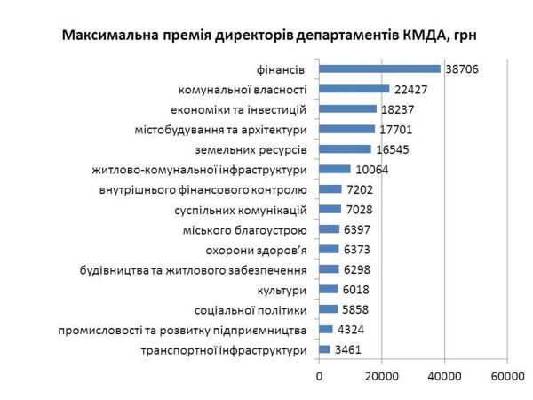 Максимальная премия, которую выписал себе столичный чиновник, составила 38,7 тыс. гривен за август 2014 года. Её получил директор Департамента финансов Владимир Репик. Немного меньше получили его заместители – от 11 до 30,7 тыс. гривен.