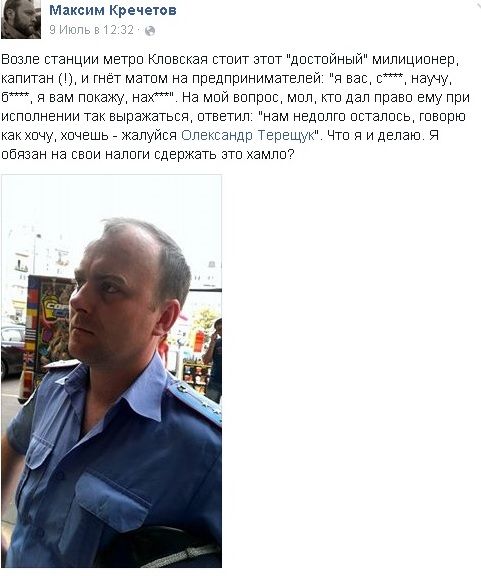 "Возле станции метро "Кловская" стоит этот "достойный" милиционер, капитан, и гнет матом на предпринимателей: "Я вас, с****, научу, б****, я вам покажу, нах***". На мой вопрос, мол, кто дал право ему при исполнении так выражаться, ответил: "Нам недолго осталось, говорю, как хочу, хочешь - жалуйся Терещуку". Что я и делаю", - сообщил Кречетов.