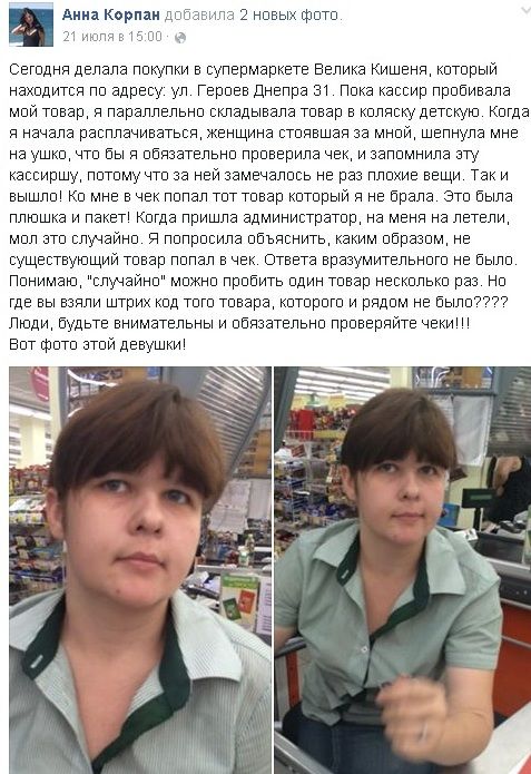 "Сегодня (21 июля, - Ред.) делала покупки в супермаркете "Велика Кишеня", который находится по адресу: ул. Героев Днепра, 31. Пока кассир пробивала мой товар, я параллельно складывала товар в коляску детскую. Когда я начала расплачиваться, женщина, стоявшая за мной, шепнула мне на ушко, чтобы я обязательно проверила чек, и запомнила эту кассиршу. Потому что за ней замечались не раз плохие вещи", - рассказала киевлянка.