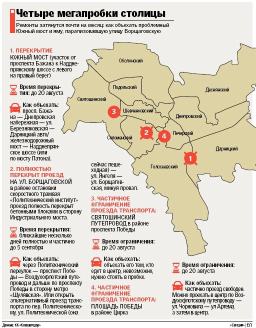 Больше всего проблем вызывает огромная яма на ул. Борщаговской, которая образовалась после аварии на коллекторе — под землю ушло полторы полосы дороги. Сейчас улица Борщаговская полностью перекрыта бетонными блоками возле станции скоростного трамвая «Политехнический институт». Ремонтные работы продлятся до 5 сентября. Из-за этого изменилась работа маршруток, которые возят людей от станции метро «КПИ». Теперь они стоят на ул. Полевой, а конечная — метро «Шулявская».