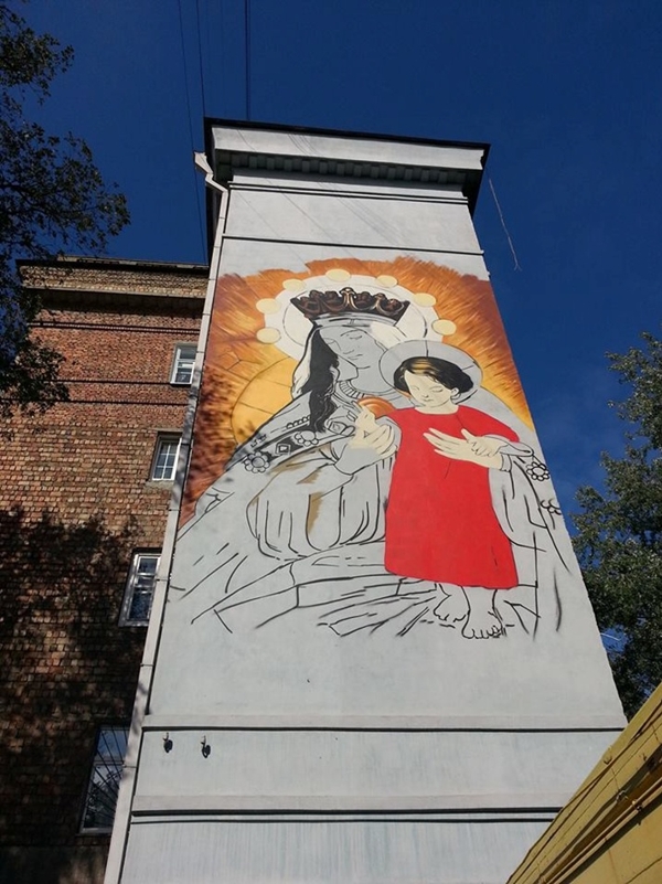 В Святошинском районе Киева рисуют очередной мурал. Картина с изображением Девы Марии появится на стене дома по проспекту Победы, 73/1 напротив церкви Святого Пантелеймона. Художественным оформлением занимается киевская команда уличных художников UpTown.