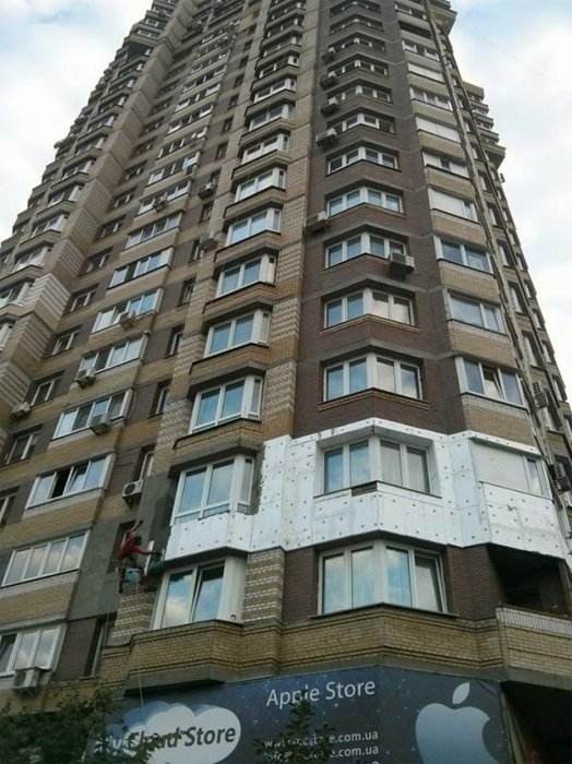 Не успели утихнуть страсти по поводу утеплителя на фасаде нового жилого комплекса в Голосеево, как в Дарницком районе житель новостроя по улице Григоренко, 20, начал монтировать точно такой же.