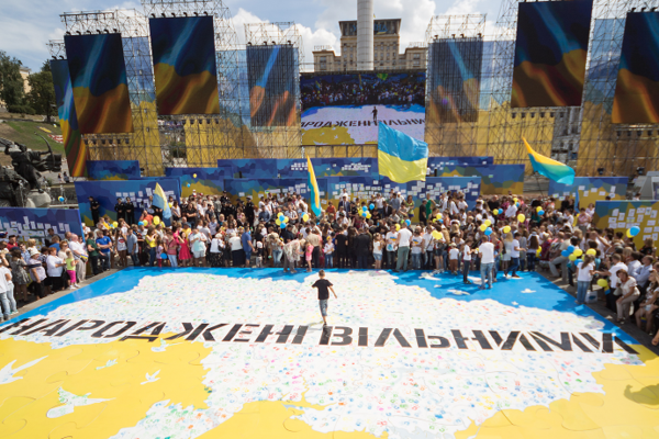 Участники акции создали карту Украины площадью 150 кв. м. из пазлов, на которых оставили разноцветные отпечатки своих ладоней, символизируя целостность и неделимость Украины.