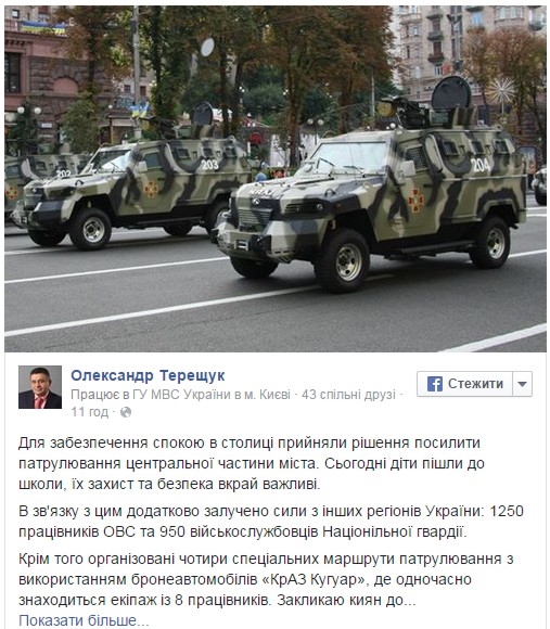 "Патрулирование проведут четыре броневика" КрАЗ Кугуар ". В каждом из них будет сразу по восемь милиционеров. Маршруты машин будут пролегать от Европейской площади до Площади Славы и площади, а также от ЦИК во Дворец Спорта на улице Бассейная", - написал Терещук.