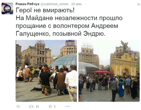 "Герої не вмирають! На Майдане Незалежности прошло прощание с волонтером Андреем Галущенко, позывной Эндрю", - написал активист.