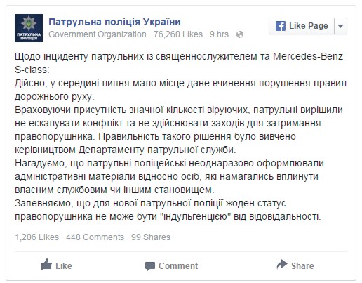 В свою очередь, Патрульная полиция, в комментарии к произошедшему инциденту, который произошел еще в июле, на своей странице в Facebook отметила, что "патрульные, учитывая присутствие большого количества верующих, решили не идти на эскалацию конфликта и не задерживать правонарушителя."