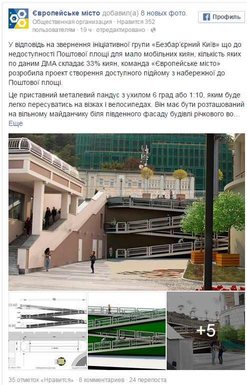 Реконструированная Почтовая площадь оказалась недоступной для маломобильных жителей Киева, а их численность составляет 33% киевлян. В этой связи инициативная группа «Безбарьерный Киев» обратилась к специалистам по городскому дизайну «Европейский город» с просьбой сделать подъем с набережной доступным.