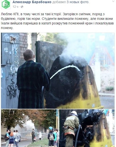 "Загорелся мусорник, рядом со зданием, горел так норм. Студенты вызвали пожарную. Но пока они ехали, вышел парнишка в халате, раскрутил пожарный кран и локализовал пожар", - рассказал Барабошко.