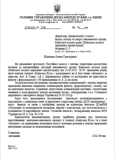 Согласно рекомендациям Главного управления Госсанэпидслужбы Киева о необходимости временной приостановки учебно-воспитательного процесса в гимназии «Киевская Русь» и в лицее «Интеллект» до приведения показателей содержания химических веществ в воздухе помещений учебных заведений к нормативным показателям, в обоих учебных заведениях перенесены осенние каникулы. Они продлятся с 28 сентября по 9 октября включительно. Об этом сообщает пресс-служба горадминистрации.