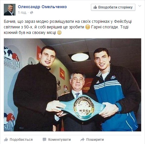 Бывший мэр Киева Александр Омельченко впал в ностальгию и выложил в соцсети фотографию 90-х годов, где он запечатлен вместе с братьями Кличко, одержавшими очередную победу на боксерском ринге.