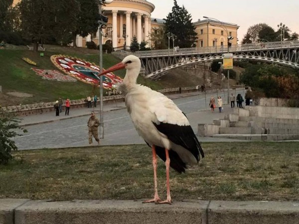 В столице Украины Киеве аист прогулялся по Крещатику. Пернатый символ благосостояния неспешно прогуливался улицей и совсем не пугался людей, которые принесли ему воды.