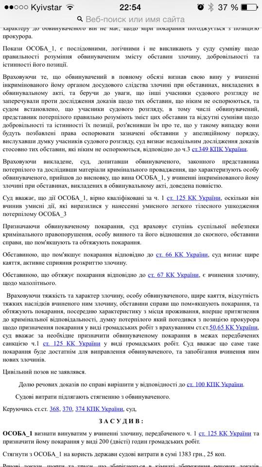 В прокуратуре Киевской области объясняют: тогда уголовное производство было открыто по ч. 1 ст. 125 (умышленное легкое телесное повреждение) УК Украины. По ней злоумышленник мог отделаться и штрафом в 850 грн (это минимальное наказание, предусмотренное статьей). "Но суд вынес более строгое решение. 200 часов общественных работ. Кроме того, отец пострадавшего мальчика, который представлял в суде его интересы, сказал, что он удовлетворен приговором. Ведь так злоумышленник не просто заплатит деньги за свое правонарушение, а понесет хотя бы такое наказание", – говорят в прокуратуре.