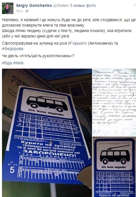 "Наверное, я наивен… Но надеюсь, что это поможет вернуть ключи и лекарство владельцу. Жаль пожилого человека (судя по тексту, человек пожилой), который потерял (или у него украли) ценные для него вещи", - отметил Гориченко.