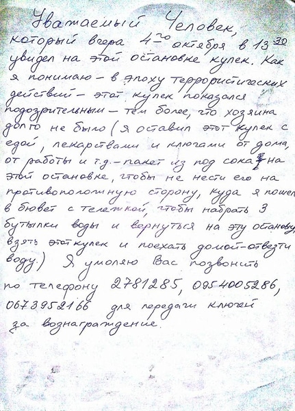 Киевлянин оставил трогательное письмо: прошу вернуть кулек с лекарствами и ключами