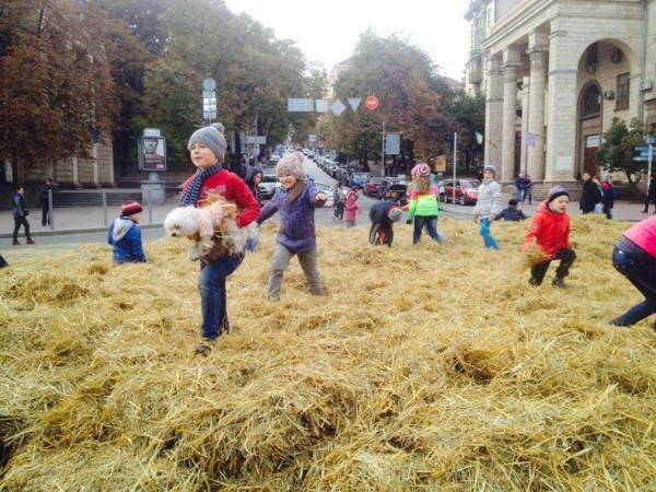 На Крещатике прошла развлекательная акция для молодежи. Дети и взрослые вдоволь порезвились на сене, которое высыпали прямо на пешеходном Крещатике, напротив улицы Прорезной.