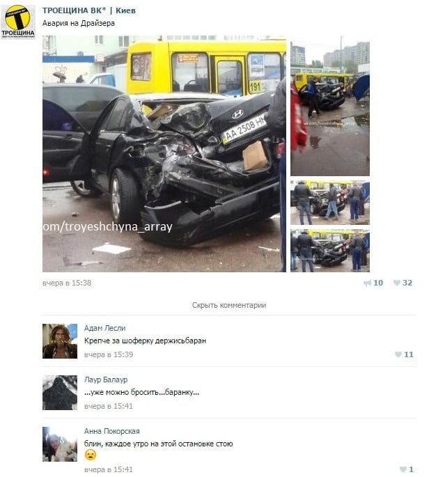 "Я там стояла... Жестко понесло мужика по мокрому асфальту. Счастье, на остановке никого не было в тот момент!" – сообщила киевлянка Марина Бондаренко.