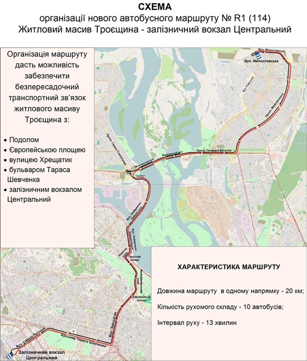 Хорошая новость для жителей Троещины. С 28 октября в столице появится новый автобусный маршрут №114. Его курс – с улицы Милославской (от ул. Радунской) до центрально железнодорожного вокзала. Проезжать автобус будет через остановки на просп. Владимира Маяквского – просп. Генерала Ватутина – Московский просп. – ул. Набережно-Рыбальская – ул. Набережно-Крещатицкая – ул. Борисоглебская – ул. Петра Сагайдачного – Владимирский спуск – ул. Крещатик – бул. Тараса Шевченко – ул. Симона Петлюры – железнодорожный вокзал "Центральный".
