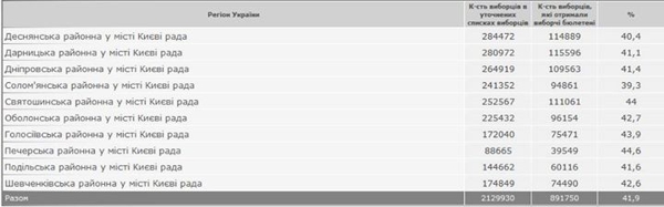 Самая высокая явка на Печерске - 44,6%. Самые пассивные избиратели в Соломенском районе. Там на участки не пришли и 40% изюирателей, Средний показатель по городу составил 41,9%.