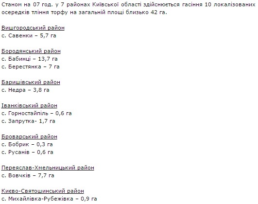 По состоянию на 7.00 2 ноября в 7 районах Киевской области осуществляется тушение 10 локализованных очагов тления торфа на общей площади около 42 га. Об этом сообщили в ГосЧС Украины.