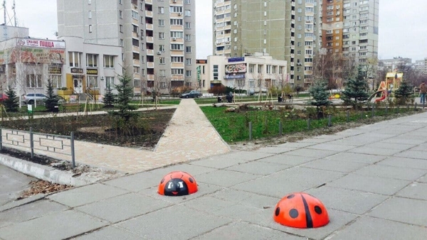 В Подольском районе Киева на тротуаре возле сквера на ул. Порика появились две божьих коровки – раскрашенные полусферы, которые установили для пресечения незаконной парковки.
