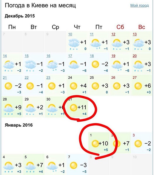 Другие сайты опубликовали более сдержанные прогнозы - до +5 градусов днем в последний день этого года и первый день 2016 года и возможный снег с дождем.