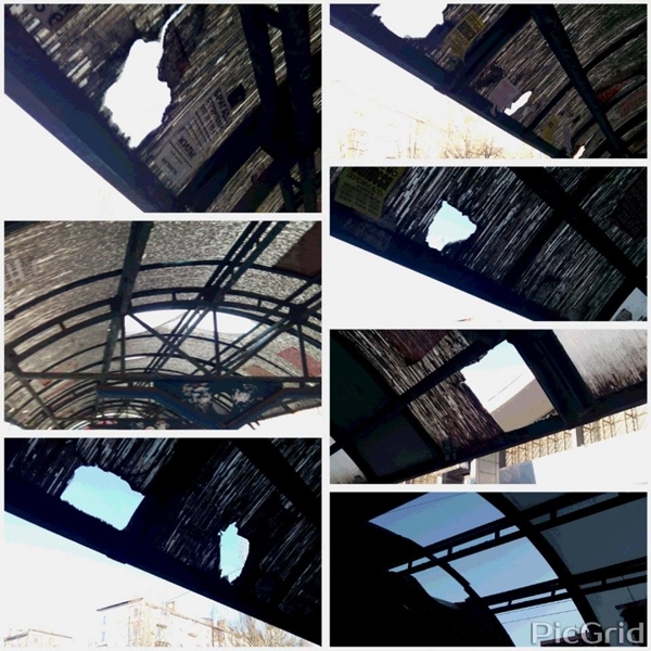 Крыша на остановке общественного транспорта выглядит как после бомбежки