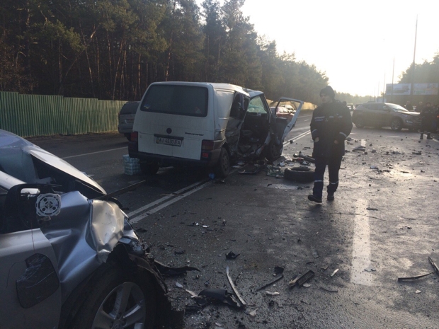 Сегодня, 21 декабря, в 8:15 на Столичном шоссе недалеко от тренировочной базы киевского «Динамо» произошло столкновение сразу 5 транспортных средств: Ford Transit, Нyundai Santa Fe, Volkswagen T4 и двух автомобилей Toyota RAV4.