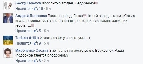 Муфтий Духовного управления мусульман Украины "УММА" Саид Исмагилов на своей странице в Facebook отметил, что "ставить туалеты напротив Стены памяти по погибшим воинам неуместно".