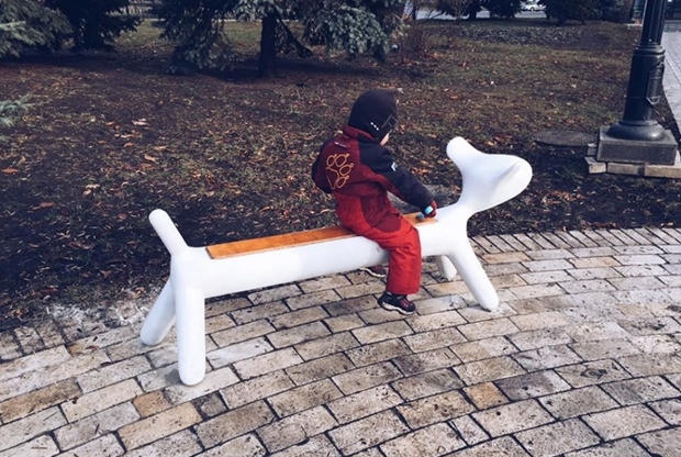 Скамейки в виде собак такс уже стали любимым местом отдыха уставших от игр малышей.