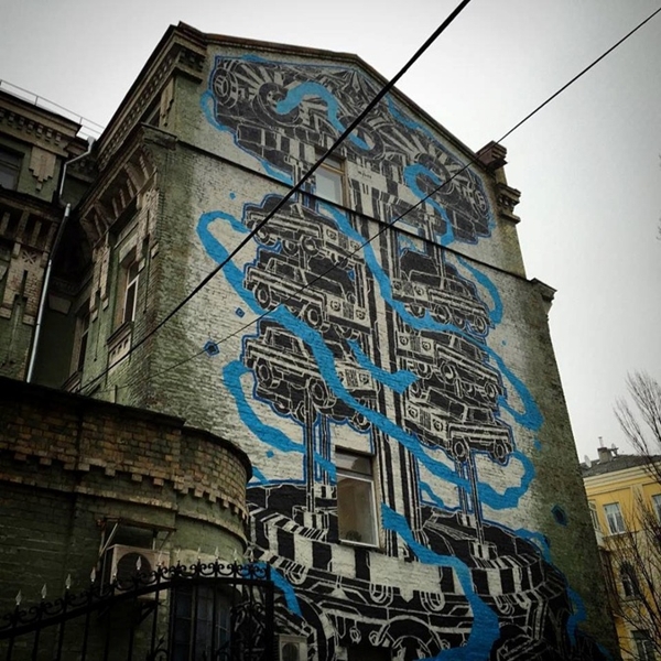 Буквально за несколько дней эту техно-красоту на стен нанес известный польский стрит-арт художник M-City. Парню пришлось работать и в мороз, и в дождь. Но оно стоило того – мурал хочется рассматривать и изучать. И, конечно же, фотографировать.