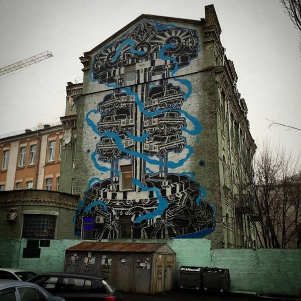 В Киеве на ул. Стрелецкой, 20б, на стене старого кирпичного 5-этажного дома появился новый мурал. Так называют огромные картины размером в несколько этажей. На ней изображена черно-белая карусель из автомобилей, увитая синей лентой басов и битов из стерео-системы.