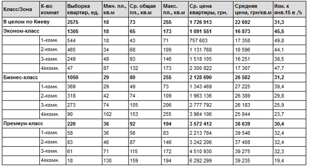 За 2015 год гривневые цены увеличились во всех сегментах первичной недвижимости: эконом-класс – 45,5%; бизнес-класс – 31,2%; премиум-класс – 30,4%.